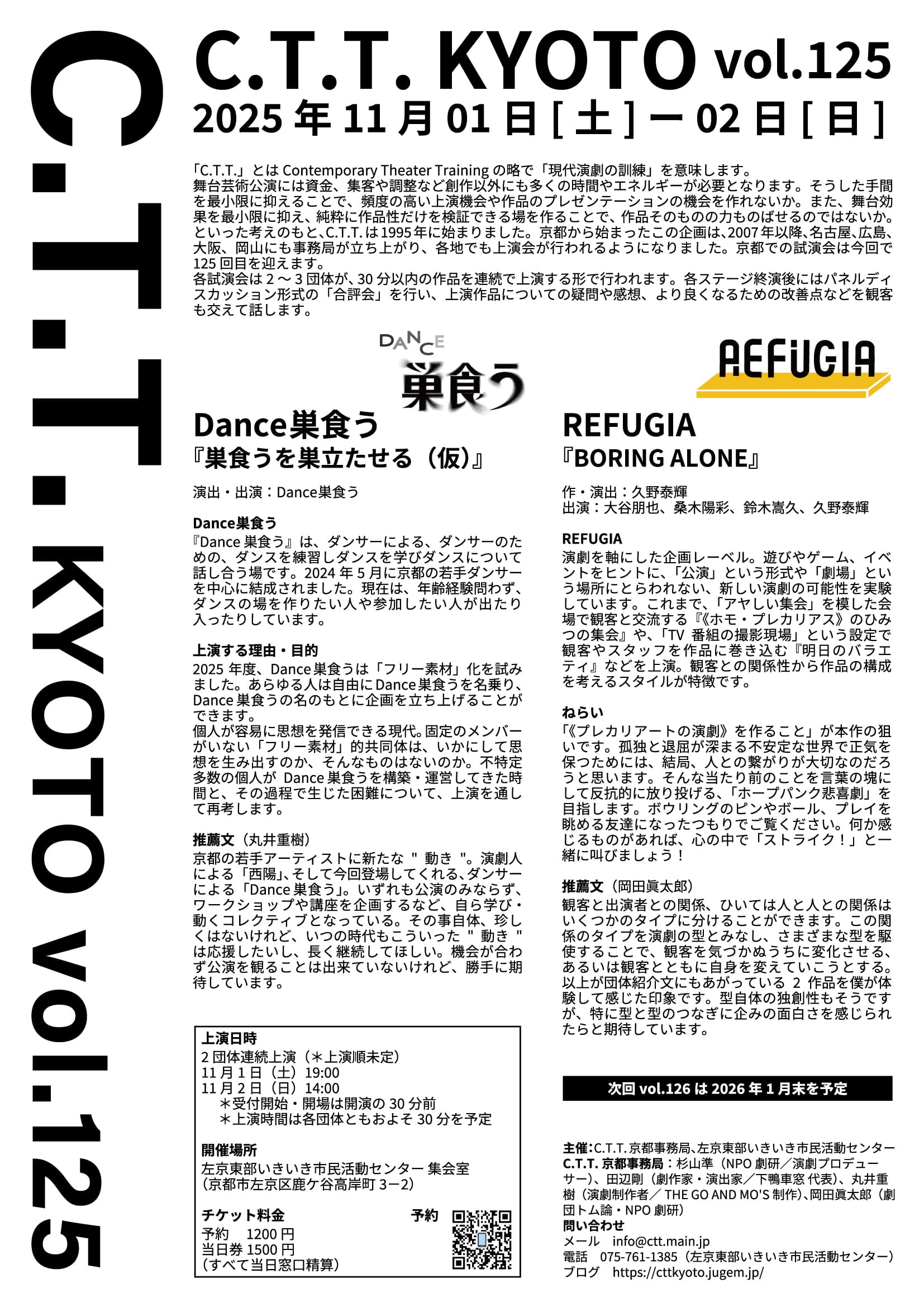 舞台芸術公演には資金、集客や調整など創作以外にも多くの時間やエネルギーが必要となります。そうした手間を最小限に抑えることで、頻度の高い上演機会や作品のプレゼンテーションの機会を作れないか。また、舞台効果を最小限に抑え、純粋に作品性だけを検証できる場を作ることで、作品そのものの力ものばせるのではないか。といった考えのもと、C.T.T.は1995年に始まりました。京都から始まったこの企画は、2007年以降、名古屋、広島、大阪、岡山にも事務局が立ち上がり、各地でも上演会が行われるようになりました。京都での試演会は今回で126回目を迎えます。