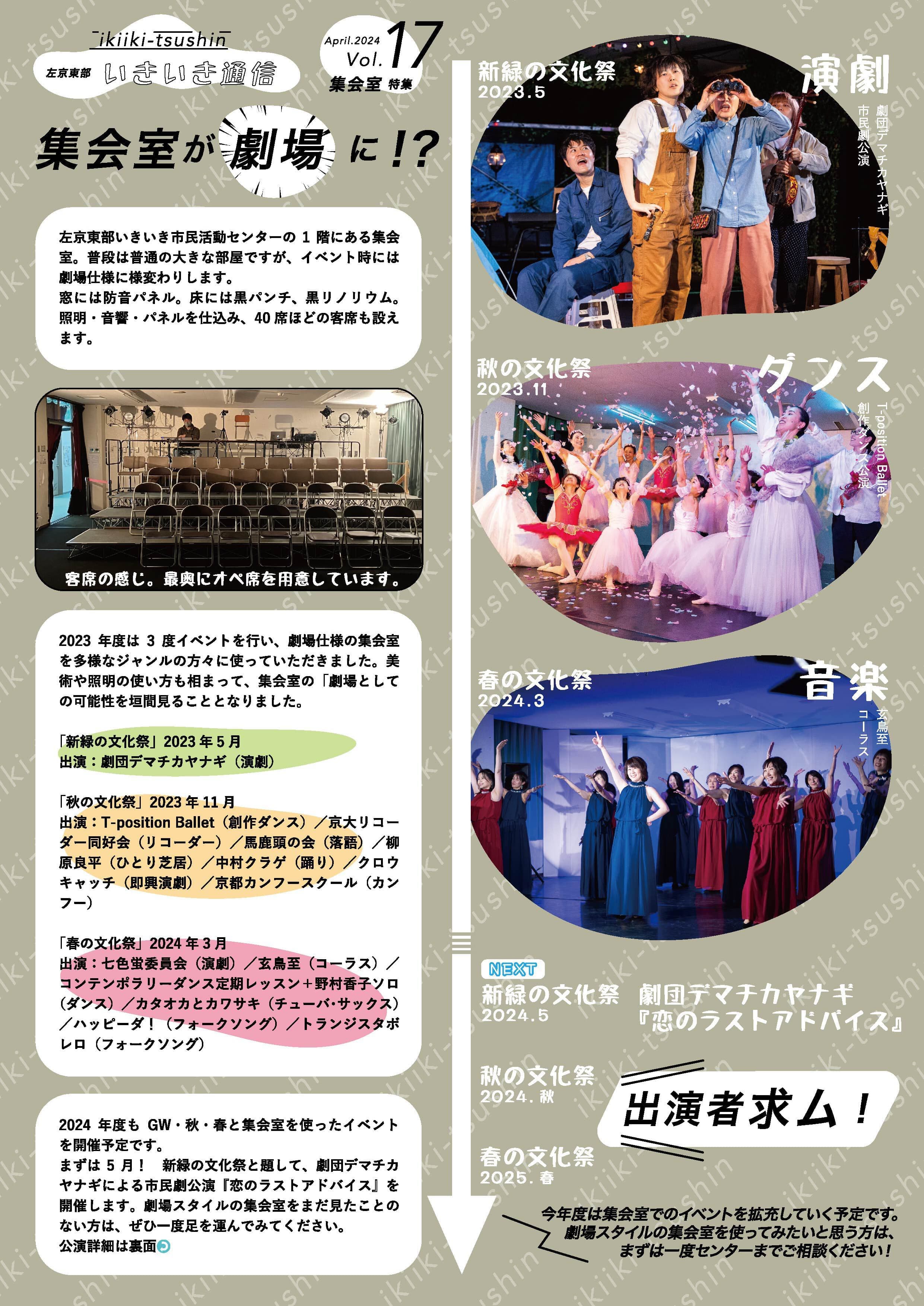 左京東部いきいき市民活動センターは,環境,教育,まちづくり,福祉,さまざまな市民活動の場として活用いただく施設です。利用者や地域のみなさまが”いきいき”するような新しい取り組みをおこなっていく予定です。この「いきいき通信」は年4回のペースで,センターの紹介やさまざまな市民活動をご紹介します。