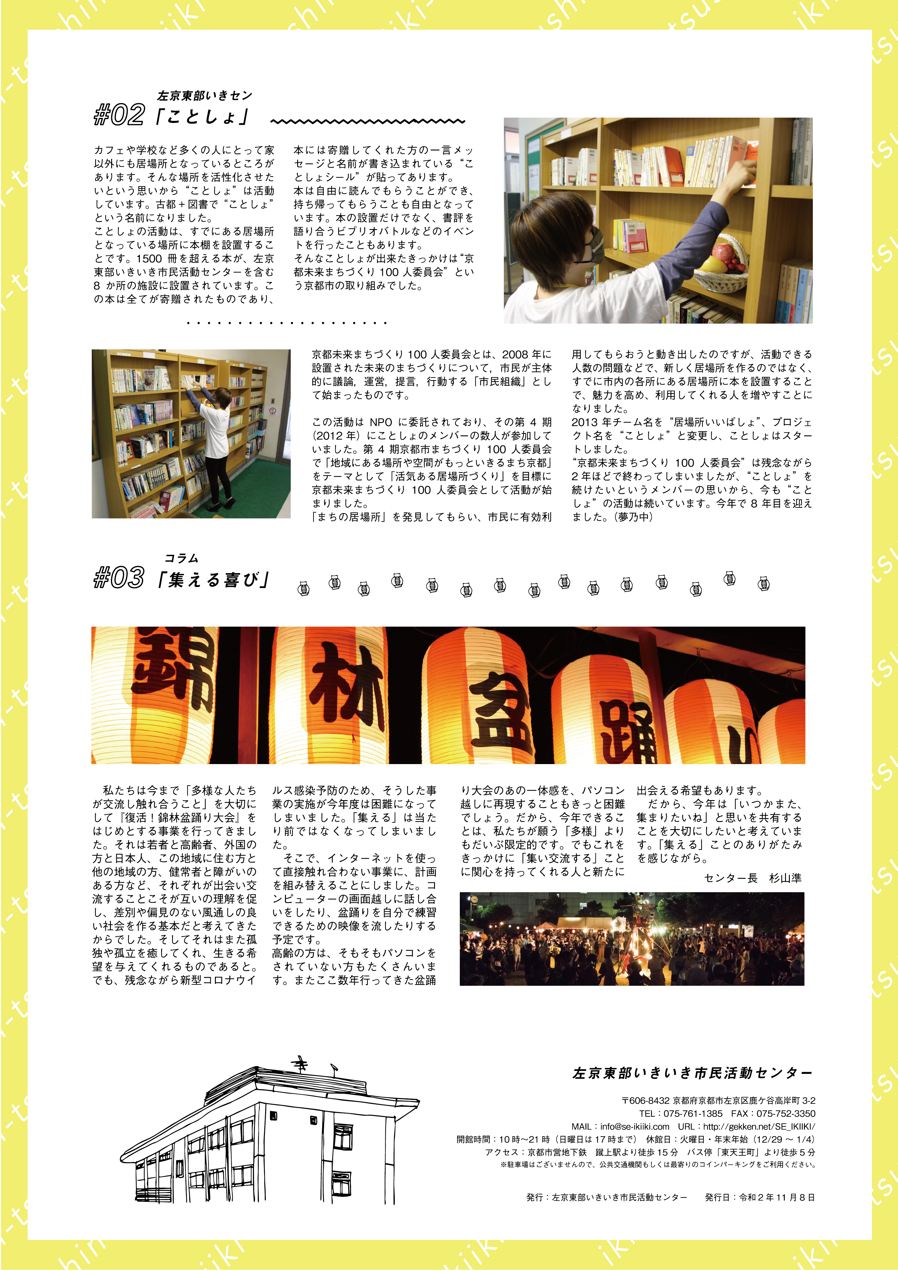 左京東部いきいき市民活動センターは,環境,教育,まちづくり,福祉,さまざまな市民活動の場として活用いただく施設です。利用者や地域のみなさまが”いきいき”するような新しい取り組みをおこなっていく予定です。この「いきいき通信」は年4回のペースで,センターの紹介やさまざまな市民活動をご紹介します。